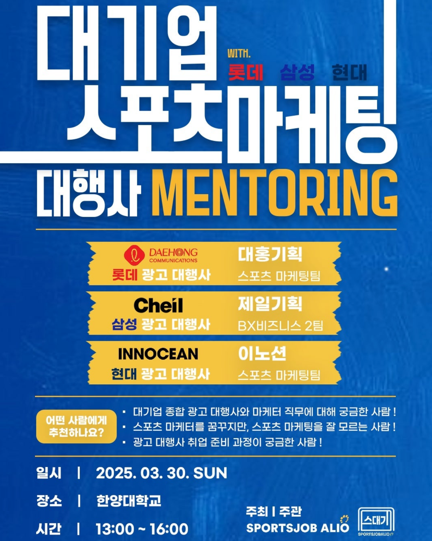 2025.03.22롯데•삼성•현대 대기업 3사 스포츠 마케터 현직자와 함께하는 멘토링‼️ 스포츠 마케터와 광고 대행사를 꿈꾸는 당신을 위한 맞춤형 멘토링‼️